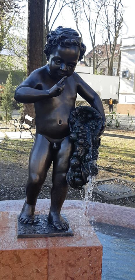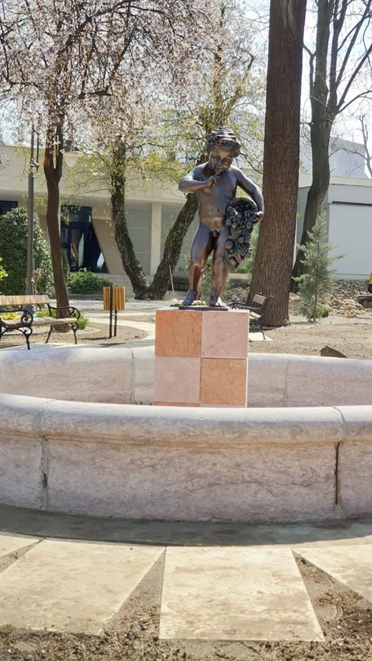 Totuşi, am avut răbdarea să privesc minunea kitcsh-ului arădean cu atenţia ardeleanului venit în târg, la cumpărături. Aşa am observat că minusculul falus îşi propune să elimine apă potabilă, probabil, piticul voinic fiind proţăpit pe un soclu îmbrăcat în faianţă (sau gresie de baie). Ce-i drept l-aş fi dat cu capul de soclu pe meseriaşul care mi-a pus mie faianţa acasă, ca să vadă cum se potrivesc plăcile. Dar, el nu-i artist, şi nici urbanist. Ce pretenţii să am? Deci, bronz cocoţat pe faianţă? Privind mai jos în fotografie am observat că pruncul din bronz vopsit, care se pişă pe faianţă, stă în mijlocul unei viitoare fântâni, cu borduri înalte din marmură. Cred că e marmură de Moneasa, după culoare şi structură. Iar în faţa micului perete din marmură al fântânii pişorcoase, se aşterne alene un trotuar din dale de beton! Superb! Patru materiale care se întâlnesc, poate, în magazinele de bricolaj! Kitcsh-ul este împlinit prin amplasarea minunii tocmai în parcul care poartă numele unui arădean, Bujor Buda,care se lupta pentru păstrarea şi valorificarea monumentelor istorice şi a valorilor artistice ale oraşului cu administraţia locală care le batjocoreşte acum.